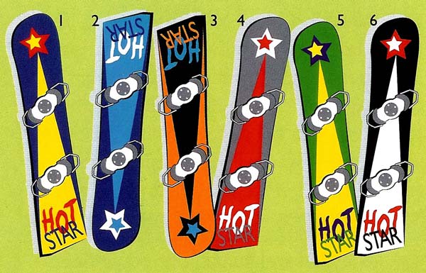 Answer:  Snowboard 3. On all the other snowboards, the word ‘HOT’ is the same color as the big star, and the triangle is the same color as the small star.
