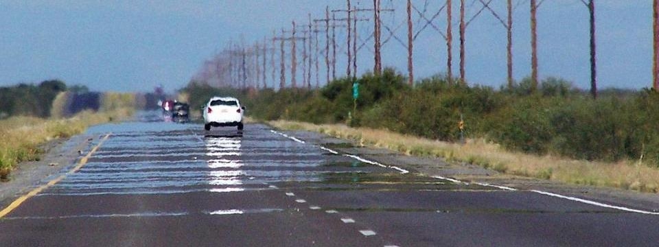 Light from the sky at a shallow angle to the road is refracted by the index gradient, making it appear as if the sky is reflected by the road’s surface. The mind interprets this as a pool of water on the road, since water also reflects the sky. The illusion fades as one gets closer.