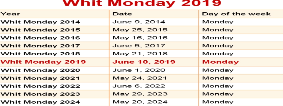 Whit Monday or Pentecost Monday (also known as Monday of the Holy Spirit) is the holiday celebrated the day after Pentecost, a moveable feast in the Christian calendar.