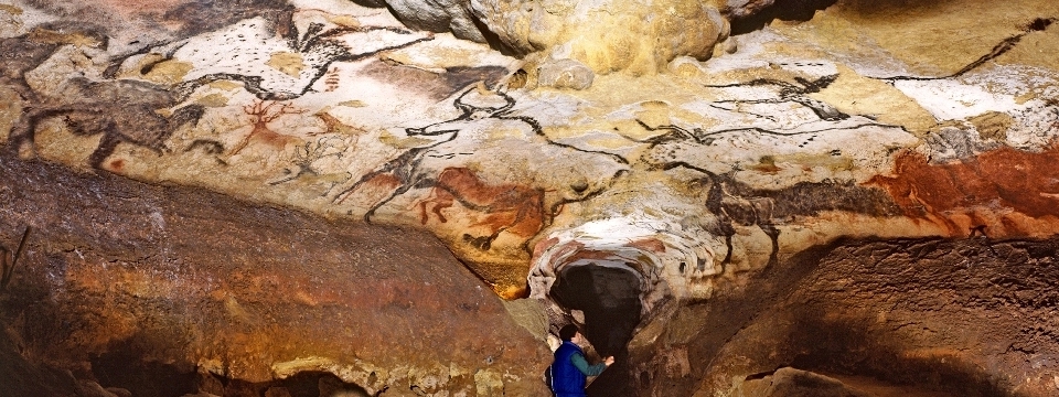 There are similar later paintings in Africa, Australia and South America, continuing until recent times in some places, though there is a worldwide tendency for open air rock art to succeed paintings deep in caves. The earliest paintings on the walls of caves in France and Spain are of animals, mostly of horses, bulls and bison. The most famous of those in France are at Lascaux, in the Dordogne area. They are painted in thick black outline. Some of the bodies are filled in with red or brown paint.