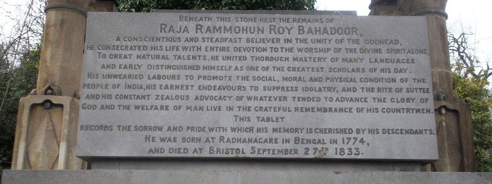 Two years after this, Dwarkanath Tagore helped pay for the chattri raised above this vault, although there is no record of his ever visiting Bristol. The chattri was designed by the artist William Prinsep, who had known Ram Mohan in Calcutta. There is a 1933 Brahmo plaque on the outside west wall of Stapleton Grove, and his first burial place in the garden is marked by railings and a granite memorial stone. His tomb and chattri at Arnos Vale are listed Grade II* by English Heritage, and attract many admiring visitors today.