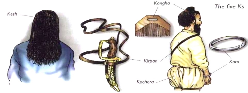 They drank amrit (nectar) out of the same bowl, although they all came from different castes. Also, they received new names with the suffix Singh (lion) and swore to keep the five K’s which were: to wear long hair (Kesh), a comb (Kangha), in the hair, soldiers’ shorts (Kachcha), a steel bangle (Kara) on the right wrist, and a sabre (Kirpan).
